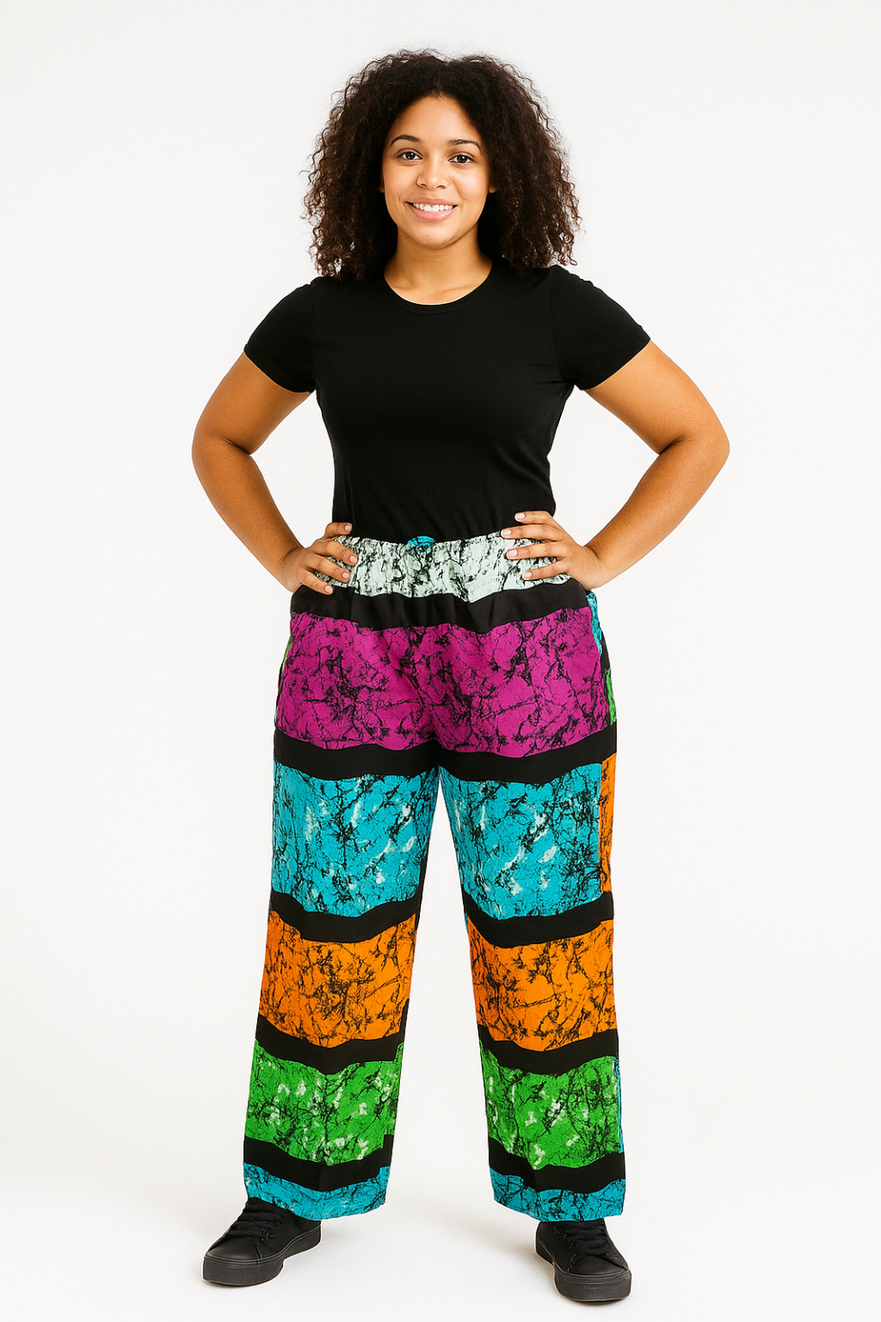 a bold expression of movement and energy through color Baggy Pants. Featuring vivid horizontal bands in cracked marble textures of purple, aqua, orange, green, and electric blue, this vibrant design is sectioned with bold black dividers for a sleek, structured aesthetic. Perfect for fearless fashionistas and those who love to channel color into their confidence.