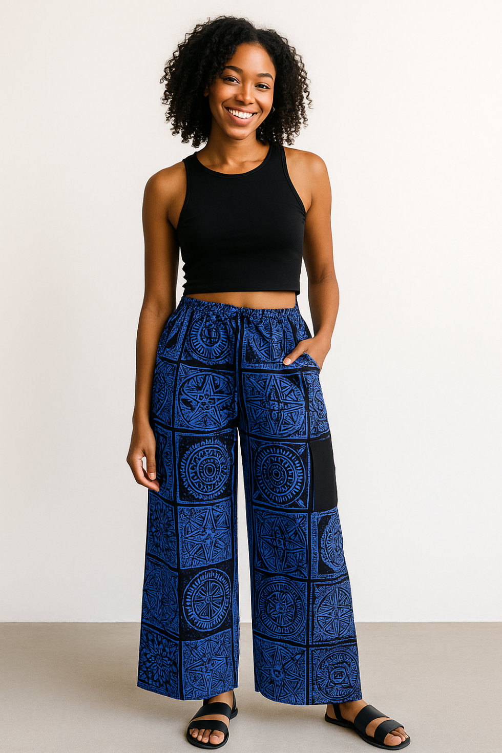 Channel effortless cool with our Indigo Medallion Baggy pants — a stunning blend of tradition and modern flair. Featuring a repeating pattern of tribal-inspired medallions and geometric symbols in bold indigo blue against jet black, this fabric tells a story in every square. The wide-leg cut offers a breezy, comfortable fit, complete with a drawstring waist and a contrast patch pocket for an urban edge. Perfect for casual days, creative vibes, or cultural celebrations, Indigo Medallion is a wearable canvas of heritage and individuality.