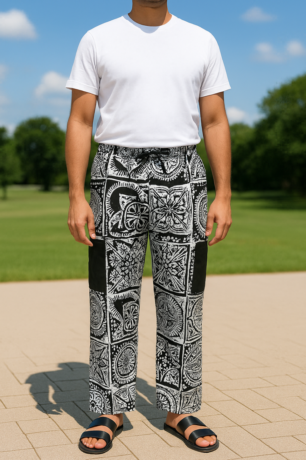 Bold. Classic. Versatile. The Monochrome Mosaic fabric is a stunning black-and-white masterpiece, inspired by traditional African patterns and modern minimalism. Featuring a grid of intricately detailed motifs, this fabric brings depth and sophistication to everyday wear. Perfect for casual outings or elevated streetwear looks, these pants pair effortlessly with a white tee or black top. Made for comfort, crafted for impact — Monochrome Mosaic is a timeless piece that speaks style without saying a word.