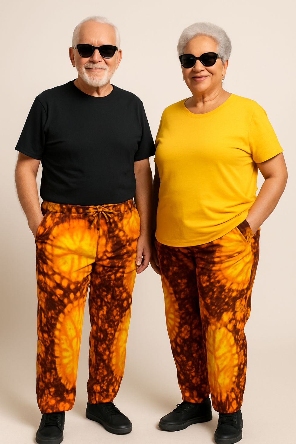 Brighten your wardrobe with the radiant energy of our Sunflare Burst fabric — a fiery blend of golden yellow and deep amber tones that evoke the warmth of a glowing sunset. The bold tie-dye pattern creates a dynamic, one-of-a-kind look on every piece, making it perfect for those who love to shine with personality. These matching pants are crafted for comfort and versatility, with an easy elastic waistband and relaxed fit. Ideal for stylish couples, family moments, or anyone who believes fashion has no age limit — Sunflare Burst is where comfort meets confident color.