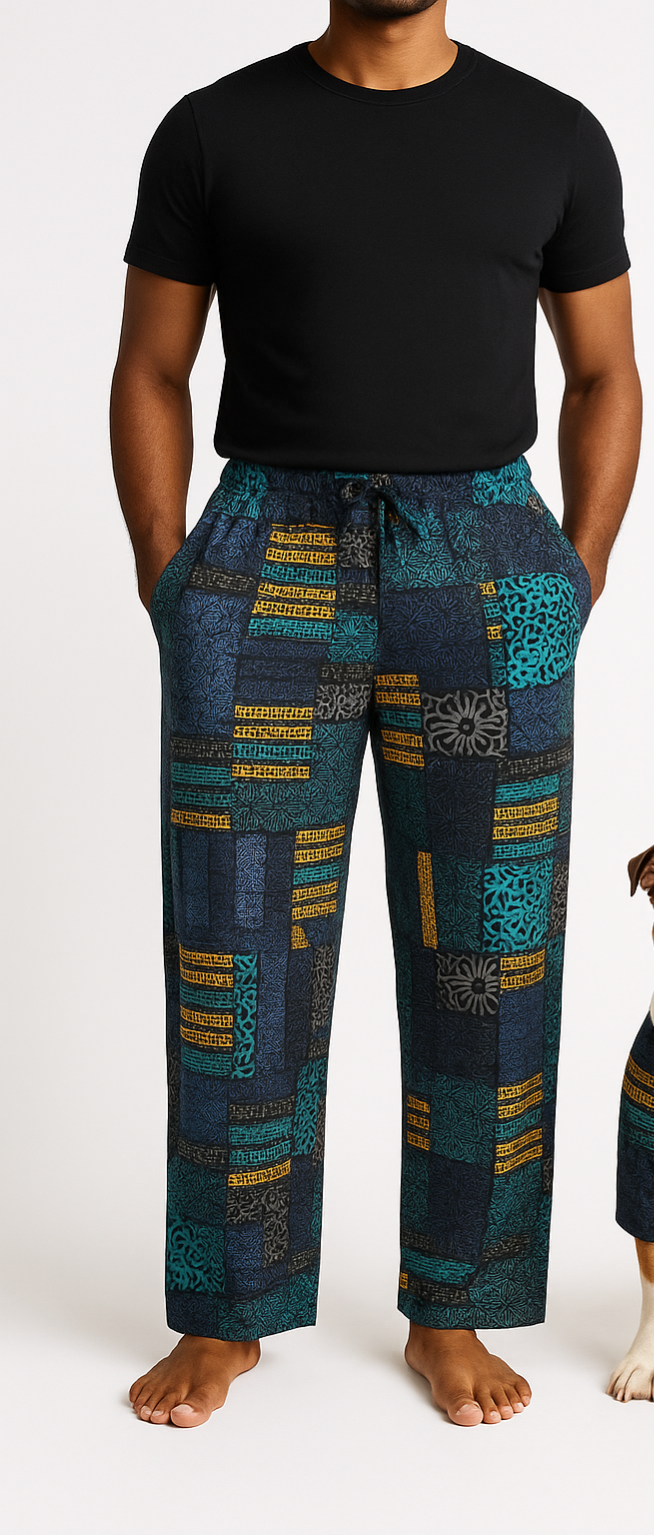 Make a bold and heartwarming style statement with our Tribe Patch Fusion collection — a coordinated set for both humans and their four-legged companions. Crafted from a vibrant patchwork of deep teal, indigo, mustard, and charcoal hues, this fabric blends traditional African motifs with modern flair. The intricate prints are arranged in a geometric layout that speaks of heritage, creativity, and connection. Perfect for lounging in style or stepping out in sync, the pants offer a relaxed fit with drawstring comfort, while the pet shirt ensures your furry friend is just as fashionable. Because matching with your dog never looked this good.